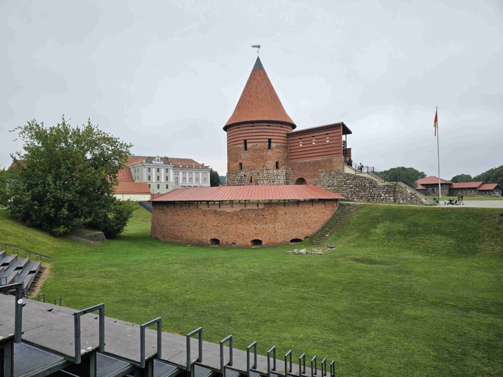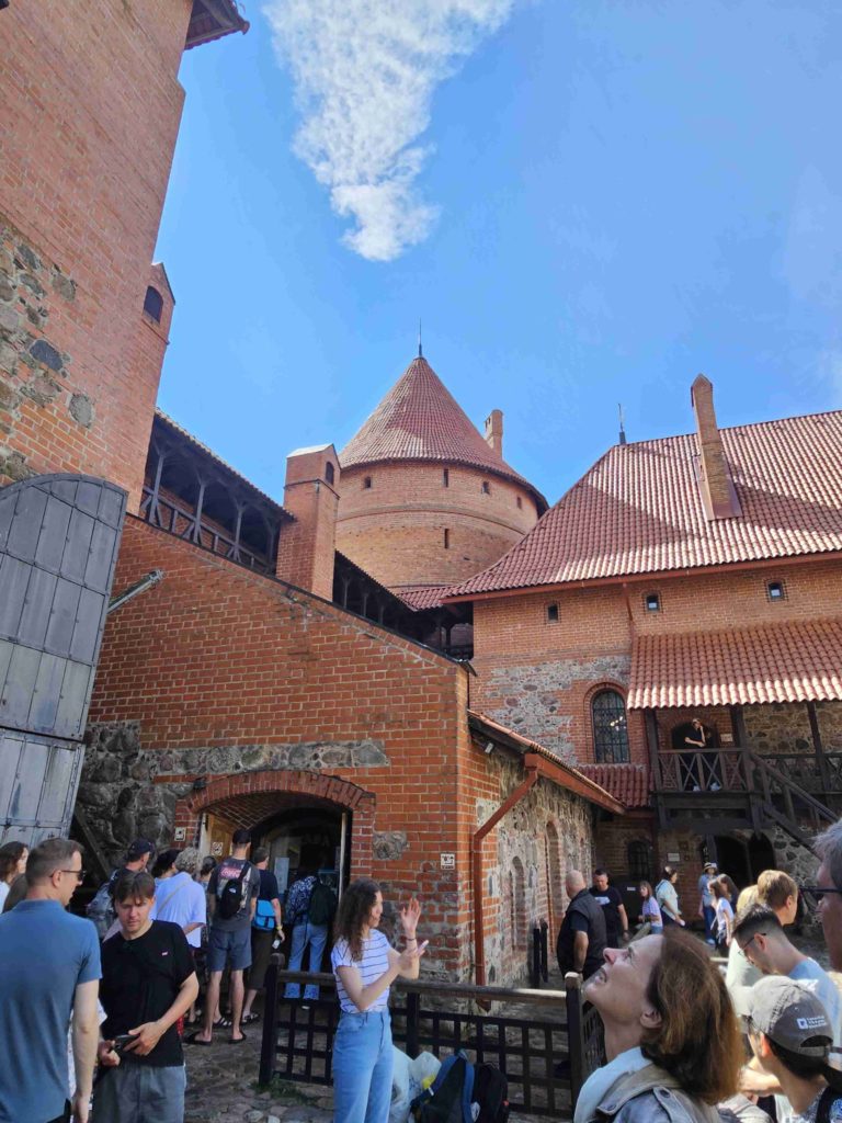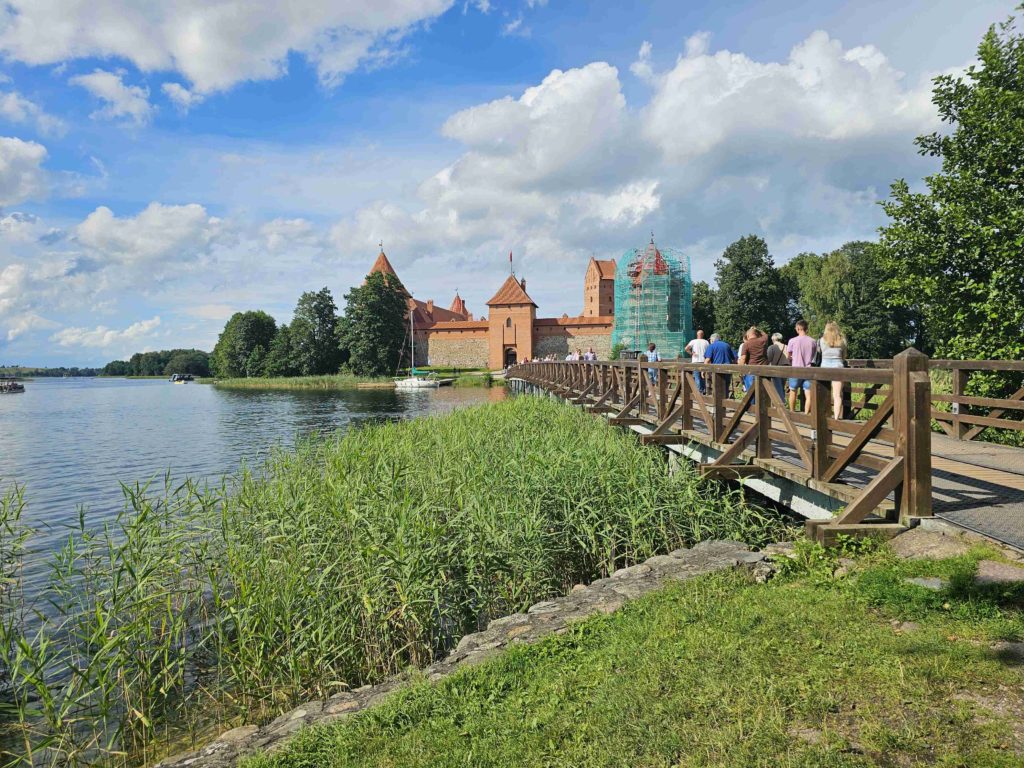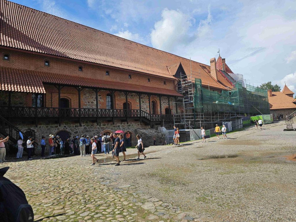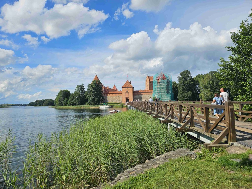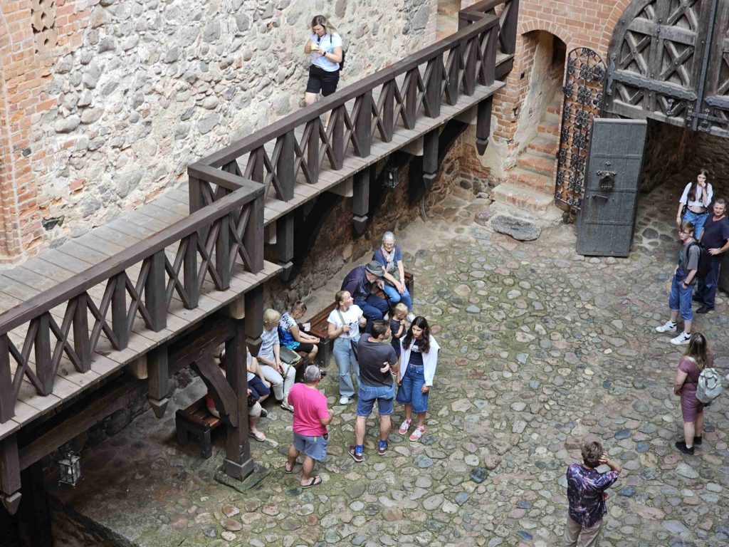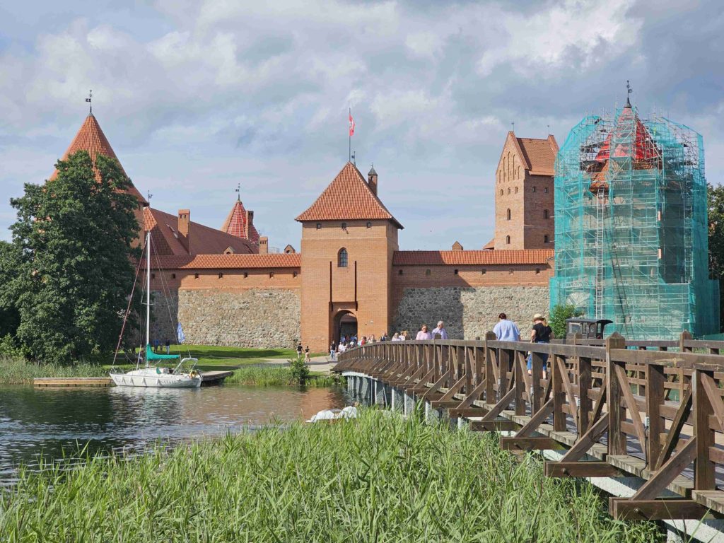 Am Nachmittag fuhren wir mit dem Bus zur ca. 30km entfernten Wasserburg Trakai. Die Burg befindet sich auf einer Insel nördlich der Stadt Trakai. Eine Brücke führt vom Ufer zum Torhaus, welches in die äußere Befestigungsmauer mit Wehrgängen und drei wuchtigen runden Ecktürmen eingebaut ist. Die symmetrisch angelegten Hauptgebäude sind über eine Brücke zugänglich. Der zwingerartige Zwischenbereich war früher aufgrund eines höheren Wasserstandes mit Wasser gefüllt. Vom Innenhof sind über Holztreppen und Außengänge die Räume bis in das zweite Stockwerk erreichbar. Das in den Hauptgebäuden befindliche Museum geht auf die Geschichte der Burg ein und stellt Ausgrabungsfunde aus. Es zeigt die Phasen der Wiederherstellungsarbeiten der Burg und verfügt auch über Modelle der Burg. Erbaut wurde die Burg in der zweiten Hälfte des 14. Jahrhunderts. Sie war zeitweise Residenz des litauischen Fürstengeschlechts bevor die Hauptstadt Vilnius gegründet wurde. Der litauische Großherzog siedelte Karaimen als Leibwache im Ort an. Nachfahren der Karaimen leben tatsächlich bis heute in dieser Gegend. Die Karäer, deutsch ‚Söhne des Lesens‘ verstehen sich als jüdische / israelitische Religionsgemeinschaft, die sich seit dem 7./8. Jahrhundert n. Chr. als Oppositionsbewegung gegen die Auslegung der jüdischen Gebote mit dem Talmud im dominierenden rabbinischen Judentum herausbildete. Bereits im Jahr 1410 verlor die Burg seine militärische Bedeutung als der Deutsche Orden in der Schlacht bei Tannenberg von einem Litauisch, polnischen Heer nachhaltig besiegt wurde.