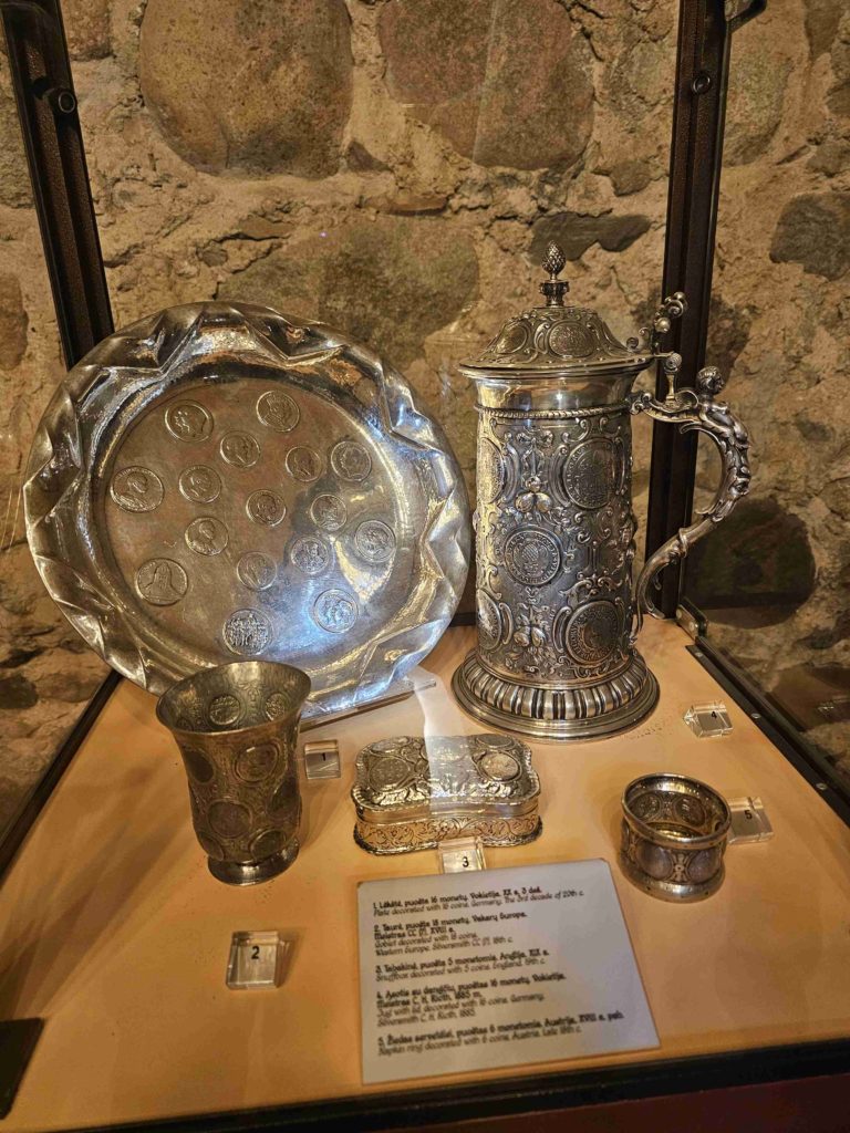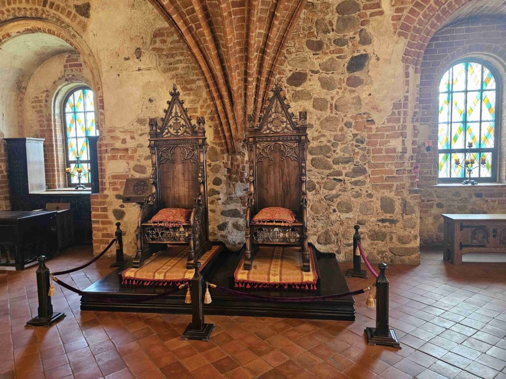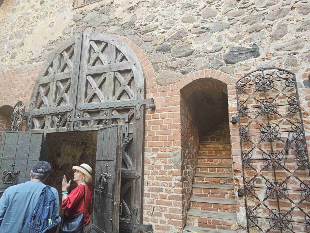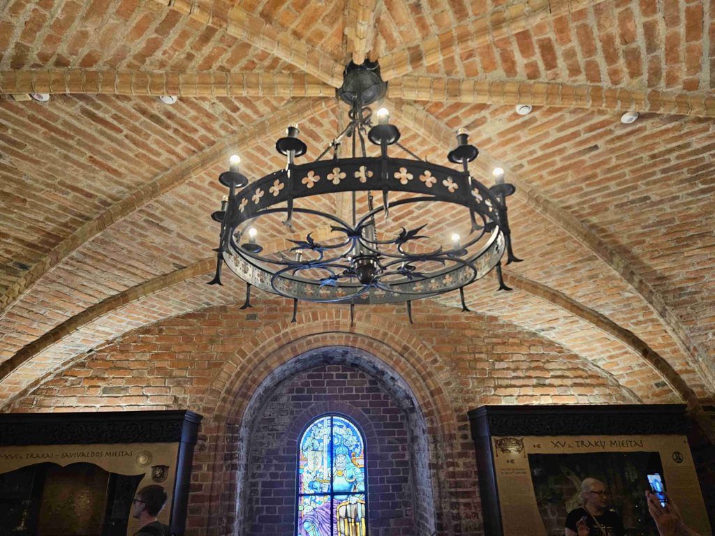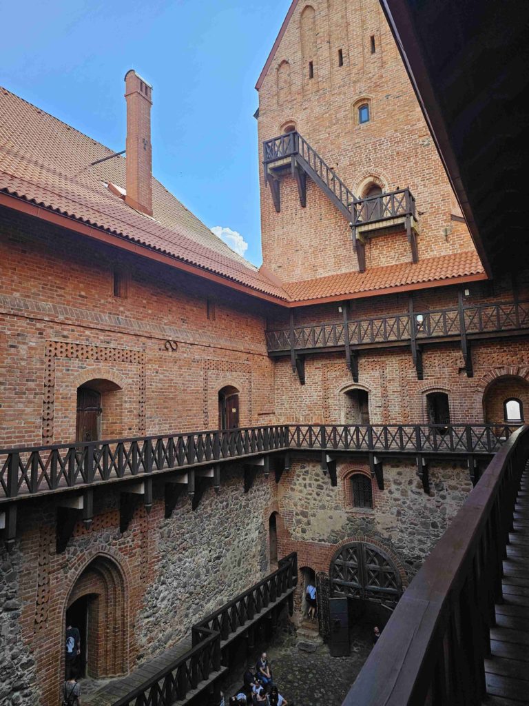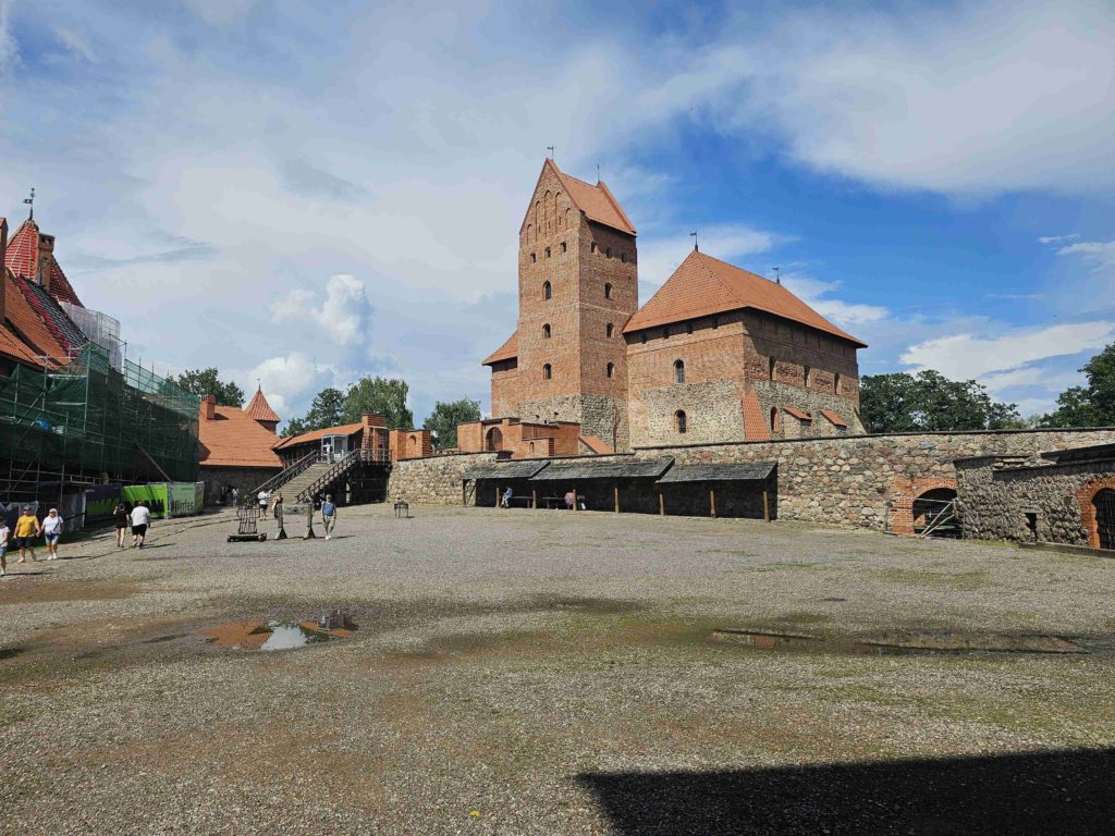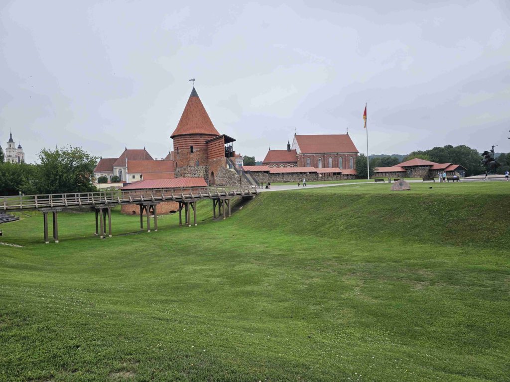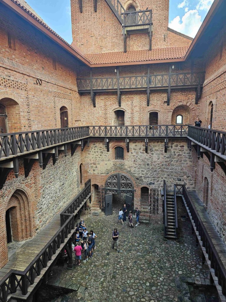 Am Nachmittag fuhren wir mit dem Bus zur ca. 30km entfernten Wasserburg Trakai. Die Burg befindet sich auf einer Insel nördlich der Stadt Trakai. Eine Brücke führt vom Ufer zum Torhaus, welches in die äußere Befestigungsmauer mit Wehrgängen und drei wuchtigen runden Ecktürmen eingebaut ist. Die symmetrisch angelegten Hauptgebäude sind über eine Brücke zugänglich. Der zwingerartige Zwischenbereich war früher aufgrund eines höheren Wasserstandes mit Wasser gefüllt. Vom Innenhof sind über Holztreppen und Außengänge die Räume bis in das zweite Stockwerk erreichbar. Das in den Hauptgebäuden befindliche Museum geht auf die Geschichte der Burg ein und stellt Ausgrabungsfunde aus. Es zeigt die Phasen der Wiederherstellungsarbeiten der Burg und verfügt auch über Modelle der Burg. Erbaut wurde die Burg in der zweiten Hälfte des 14. Jahrhunderts. Sie war zeitweise Residenz des litauischen Fürstengeschlechts bevor die Hauptstadt Vilnius gegründet wurde. Der litauische Großherzog siedelte Karaimen als Leibwache im Ort an. Nachfahren der Karaimen leben tatsächlich bis heute in dieser Gegend. Die Karäer, deutsch ‚Söhne des Lesens‘ verstehen sich als jüdische / israelitische Religionsgemeinschaft, die sich seit dem 7./8. Jahrhundert n. Chr. als Oppositionsbewegung gegen die Auslegung der jüdischen Gebote mit dem Talmud im dominierenden rabbinischen Judentum herausbildete. Bereits im Jahr 1410 verlor die Burg seine militärische Bedeutung als der Deutsche Orden in der Schlacht bei Tannenberg von einem Litauisch, polnischen Heer nachhaltig besiegt wurde.