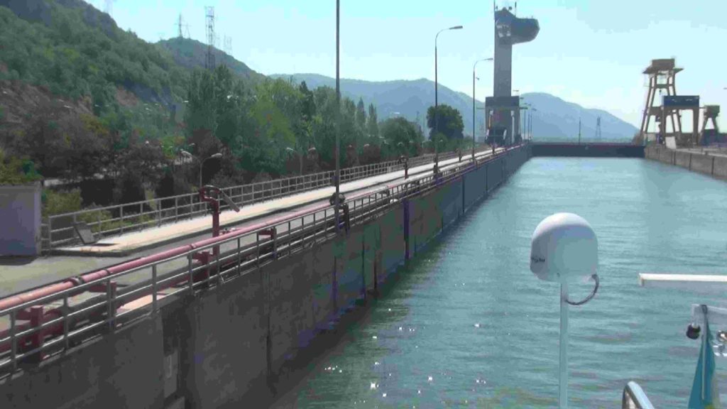 Eisernes Tor Djerdap 1 (Rumäninen) bei km 941 – Doppelschleuse Höhe 20,00m + 14,00m, gesamt 34m