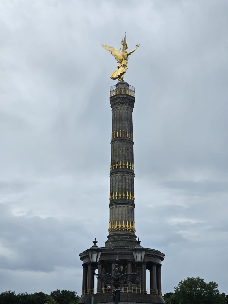 Unfortunately, we didn’t get very close to the Brandenburg Gate, as the largest fan mile in Germany for the European Football (Soccer) Championship was built around the Brandenburg Gate. The European Football Championship 2024 will take place in Germany from June 14, 2024 to July 14. Berlin is one of the main venues. The final will take place in the Berlin Olympic Stadium on July 14, 2024. The Republic Square (Platz der Republik) in front of the Reichstag was also largely cordoned off, so we couldn’t take our obligatory tourist photo here either. Bellevue Castle is the first official residence of our Federal President. Some of us still had enough energy to climb the steps to the 50m high viewing platform of the Siegessäule (Victory Column). The Siegessäule on the Großer Stern in the Tiergarten is one of the most important national monuments in Germany and the most important sights in Berlin. Built between 1864 and 1873 to commemorate the Wars of Unification. The crowning Victoria is called “Goldelse” in Berlin vernacular. The Siegessäule stands in the middle of the Großer Stern, which is designed as a six-lane roundabout and can be reached to the west and east via T-shaped pedestrian tunnels below the road. From the viewing platform we were finally able to zoom in on the Brandenburg Gate with our smartphones, so that we were able to take a somewhat acceptable photo of what is perhaps Berlin’s most important landmark. After we had descended the 285 steps to the base of the Victory Column, we agreed that we had done enough physical activity for today. We then went straight to my Berlin cousin’s apartment, where his wife had already prepared coffee and cake for us.