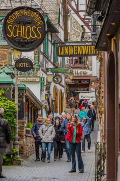 Rüdesheim is a small wine town with around 10,000 inhabitants in the Rheingau-Taunus district of Hesse. The town lies at the foot of the Niederwald opposite Bingen at the southern gateway to the Middle Rhine Valley. Rüdesheim is a tourist attraction. Drosselgasse in particular is characterized by international tourism. It is a 2 m wide and approx. 150 m long cobblestone alley that is visited by around three million people every year. The numerous wine houses, some of which are half-timbered buildings, along with gift and souvenir shops, characterize the world-famous Drosselgasse.