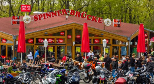 The fuel gauge is funny, a measuring stick to check how much petrol-oil mixture is still in the tank. To do this, you have to open the hood and measure it by hand. At the end of the fun we each received a GDR Trabi driving license. If my cousin hadn’t been so interested in a Trabi, I probably would never have booked this fun event. Thank you very much for this. After the Trabi Safari we switched to our Berlin cousin’s car. What a difference in quality! No more noise and no more smell! Since my Canadian cousins are bikers, it was a good idea to go out to the Spinner Bridge after the Trabi ride. The Spinner Bridge is the nickname for the Spanish Allee Bridge, which is the crossing of the AVUS from the Spanish Allee at motorway junction 3 of the federal motorway 115 in the Berlin district of Nikolassee. The bar of the same name, located directly on the bridge, is a motorcycle meeting place that has been known beyond the borders of Berlin since the early 1950s. There are two theories about the origin of the name. The first is due to the fact that the bridge has developed into a meeting place for motorcycle enthusiasts, who the residents like to call „Spinner“(weirdos). The second theory says that after the AVUS was built in 1921, many “technical nuts” (in German „Spinner“) spent hours watching the cars and motorcycles driving there.