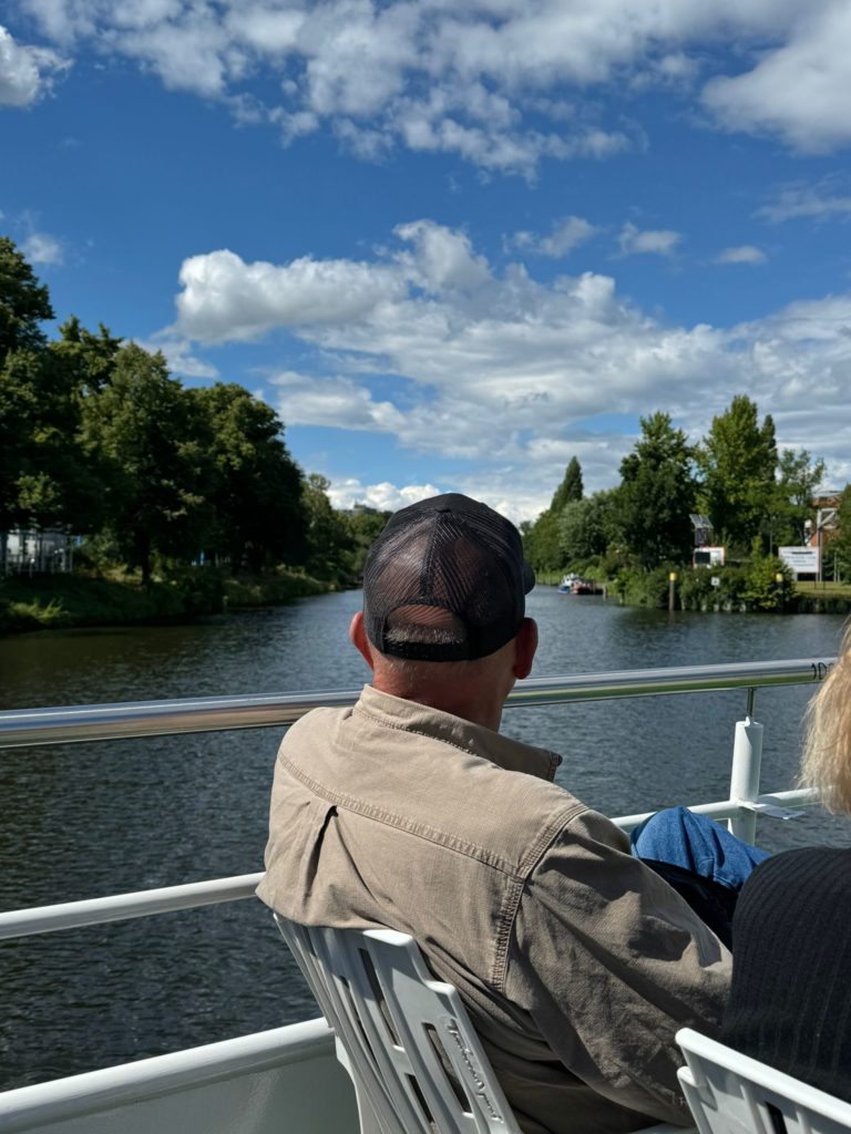 After we had already explored Berlin’s most important sights on foot on June 12th, today it was time for a change of perspective. We all went on a wonderful four-hour boat tour together across the Spree and the Landwehr Canal to see all of Berlin’s important sights from the water. The boat ride was beautiful and very relaxing. If you as a tourist have only planned a little time for Berlin, we definitely recommend prioritizing the boat trip. During the boat trip all the sights are introduced and well explained. During the tour you pass under around 40 bridges, both ancient and new and modern. The route took us through three locks. The Mühlendamm lock is located in the Mitte district east of the Mühlendamm on Fischerinsel. It lies along the course of the Spree, which is part of the Spree-Oder waterway. The Landwehr Canal is almost 11 km long and has two locks, the lower lock and the upper lock. A total of 36 bridges lead over the canal, but you should be careful when crossing under them. Many bridges are so low that you have to sit on the upper deck. The highlights of the tour are the Berlin Cathedral, the Museum Island, the city palace, the House of World Cultures, the main train station, the Nikolaiviertel, the Mühlendamm lock, the Oberbaum Bridge, the technology museum with the raisin bomber, the zoological garden, the government district with the Federal Chancellery and the Reichstag.