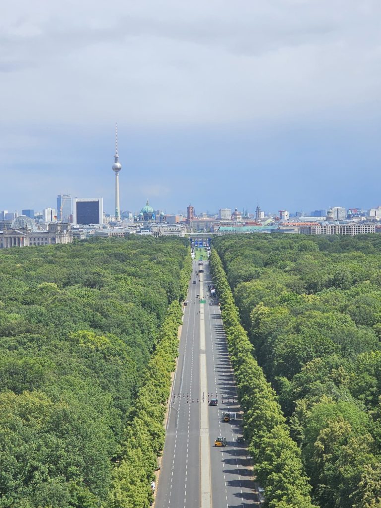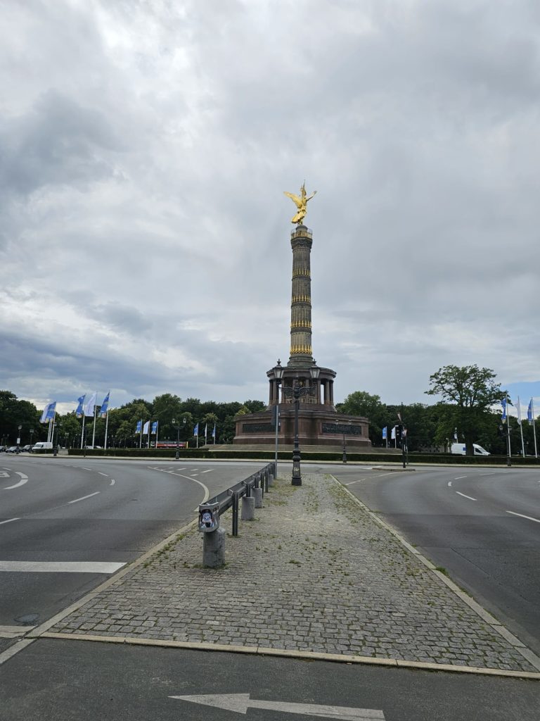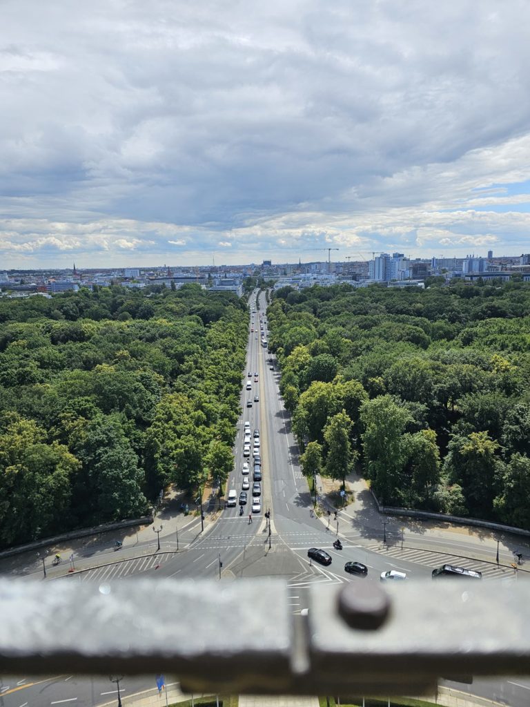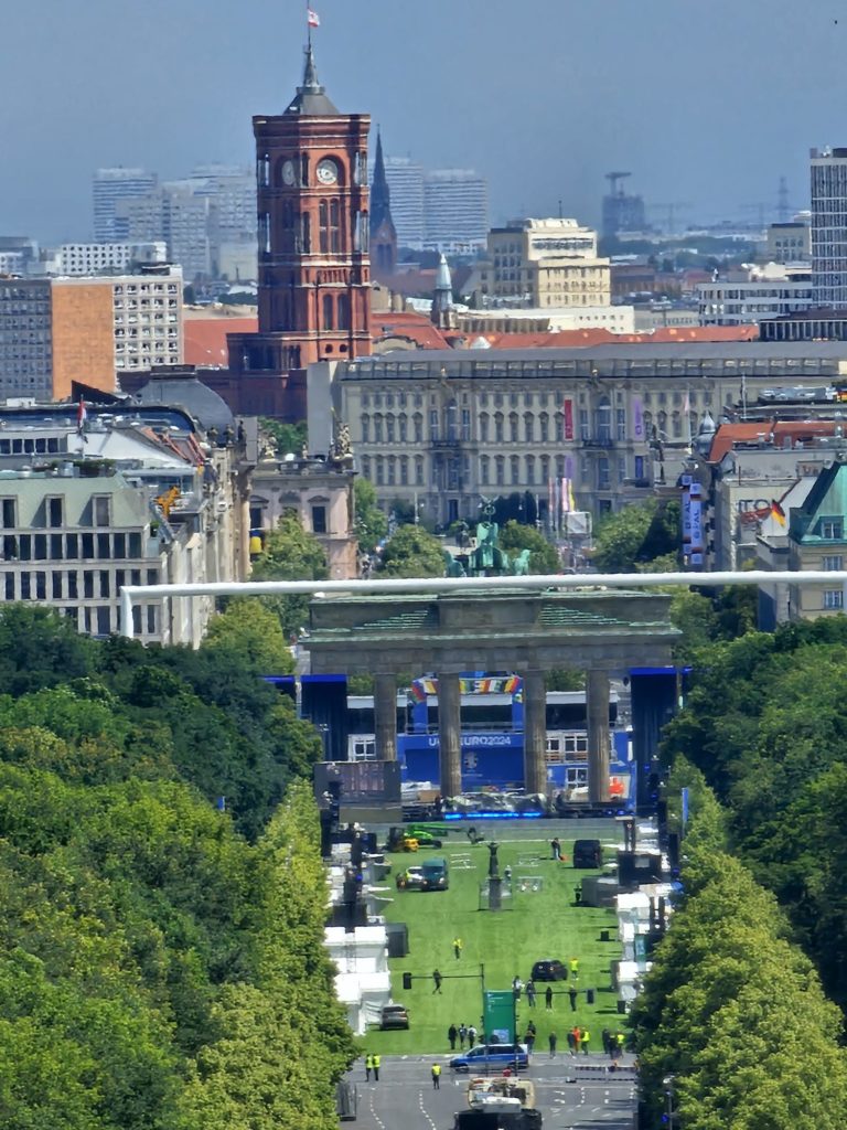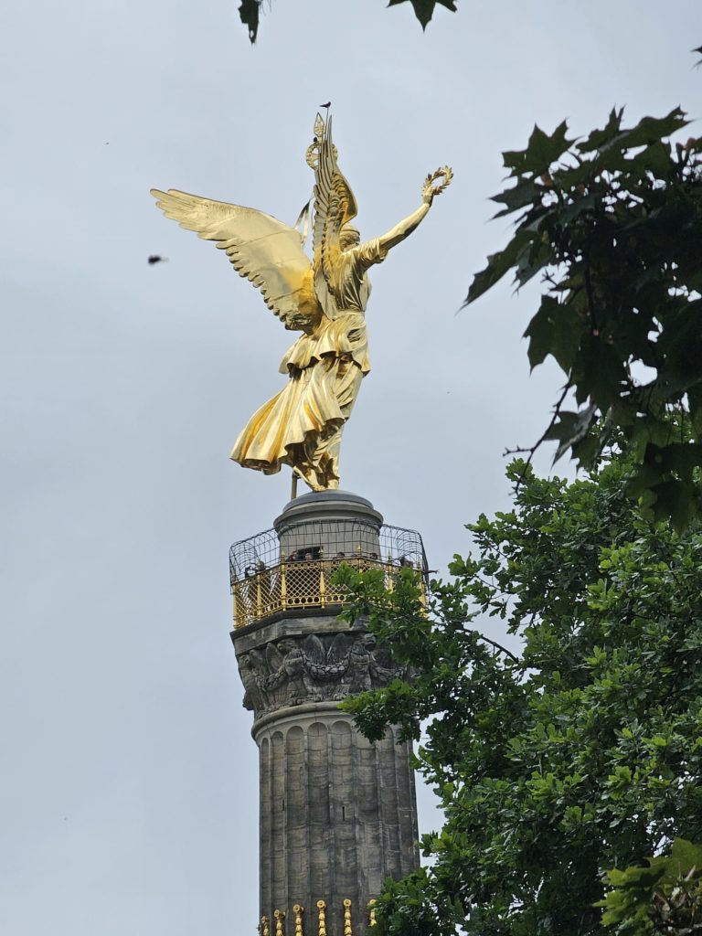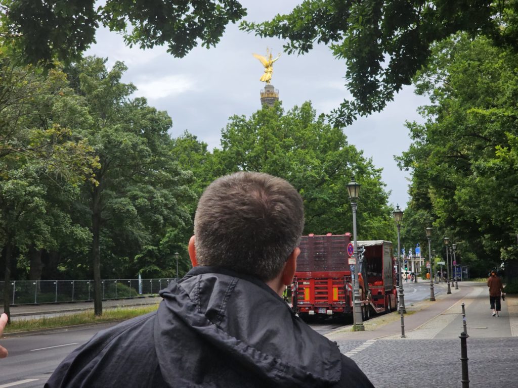 Unfortunately, we didn’t get very close to the Brandenburg Gate, as the largest fan mile in Germany for the European Football (Soccer) Championship was built around the Brandenburg Gate. The European Football Championship 2024 will take place in Germany from June 14, 2024 to July 14. Berlin is one of the main venues. The final will take place in the Berlin Olympic Stadium on July 14, 2024. The Republic Square (Platz der Republik) in front of the Reichstag was also largely cordoned off, so we couldn’t take our obligatory tourist photo here either. Bellevue Castle is the first official residence of our Federal President. Some of us still had enough energy to climb the steps to the 50m high viewing platform of the Siegessäule (Victory Column). The Siegessäule on the Großer Stern in the Tiergarten is one of the most important national monuments in Germany and the most important sights in Berlin. Built between 1864 and 1873 to commemorate the Wars of Unification. The crowning Victoria is called “Goldelse” in Berlin vernacular. The Siegessäule stands in the middle of the Großer Stern, which is designed as a six-lane roundabout and can be reached to the west and east via T-shaped pedestrian tunnels below the road. From the viewing platform we were finally able to zoom in on the Brandenburg Gate with our smartphones, so that we were able to take a somewhat acceptable photo of what is perhaps Berlin’s most important landmark. After we had descended the 285 steps to the base of the Victory Column, we agreed that we had done enough physical activity for today. We then went straight to my Berlin cousin’s apartment, where his wife had already prepared coffee and cake for us.