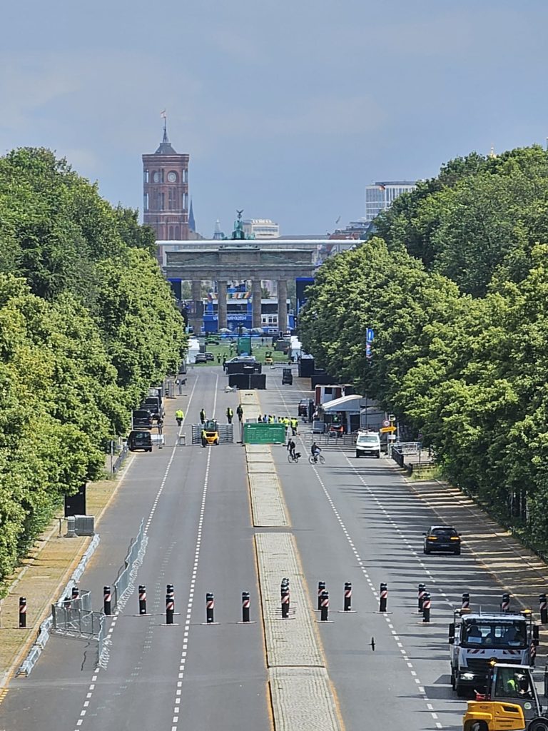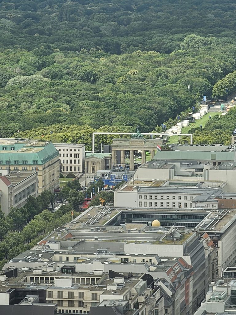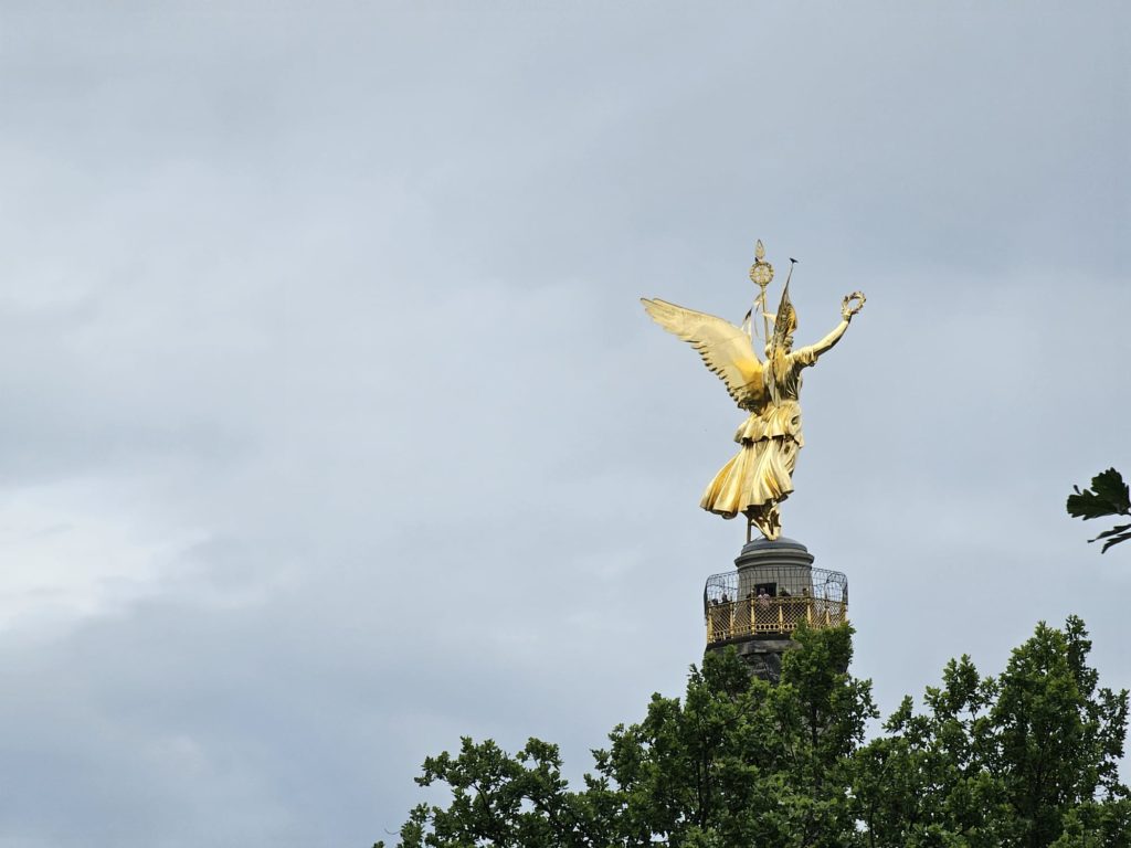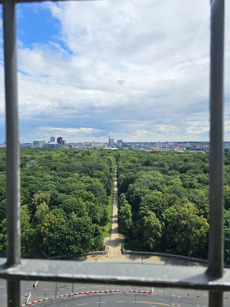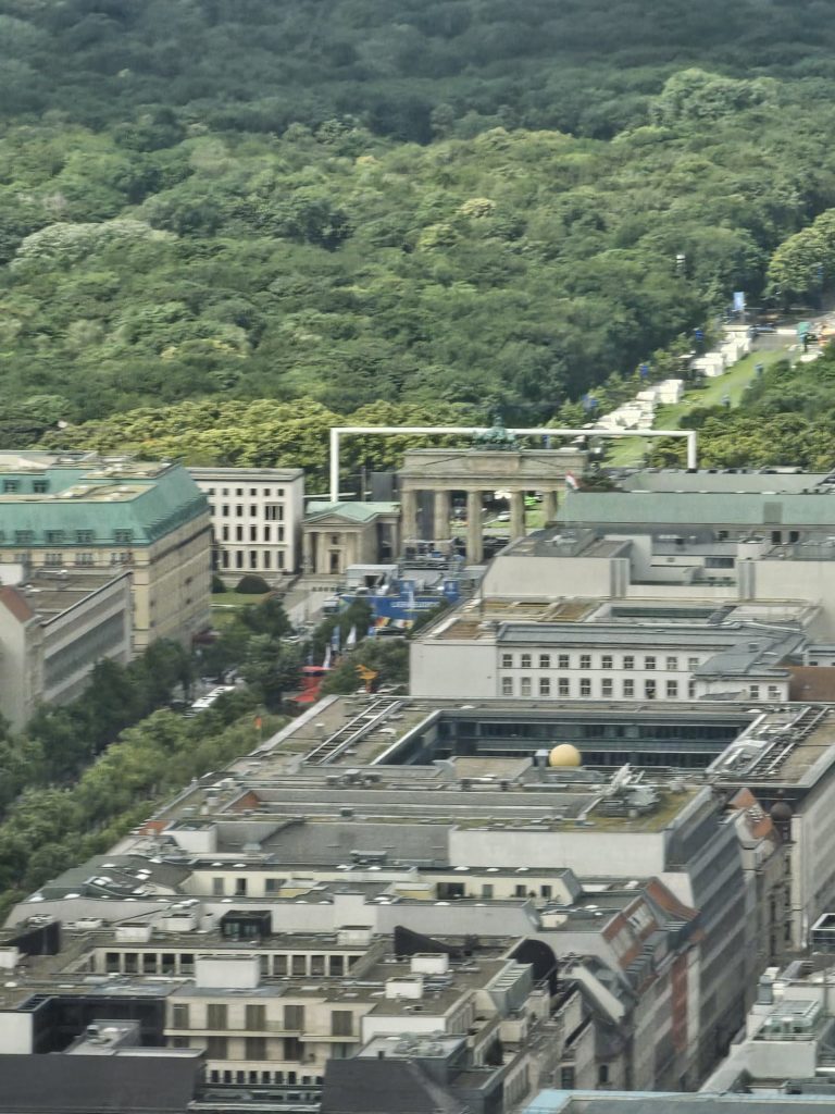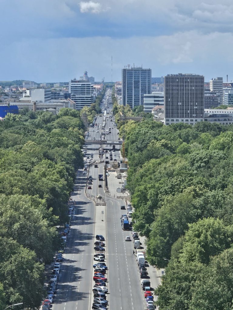 Unfortunately, we didn’t get very close to the Brandenburg Gate, as the largest fan mile in Germany for the European Football (Soccer) Championship was built around the Brandenburg Gate. The European Football Championship 2024 will take place in Germany from June 14, 2024 to July 14. Berlin is one of the main venues. The final will take place in the Berlin Olympic Stadium on July 14, 2024. The Republic Square (Platz der Republik) in front of the Reichstag was also largely cordoned off, so we couldn’t take our obligatory tourist photo here either. Bellevue Castle is the first official residence of our Federal President. Some of us still had enough energy to climb the steps to the 50m high viewing platform of the Siegessäule (Victory Column). The Siegessäule on the Großer Stern in the Tiergarten is one of the most important national monuments in Germany and the most important sights in Berlin. Built between 1864 and 1873 to commemorate the Wars of Unification. The crowning Victoria is called “Goldelse” in Berlin vernacular. The Siegessäule stands in the middle of the Großer Stern, which is designed as a six-lane roundabout and can be reached to the west and east via T-shaped pedestrian tunnels below the road. From the viewing platform we were finally able to zoom in on the Brandenburg Gate with our smartphones, so that we were able to take a somewhat acceptable photo of what is perhaps Berlin’s most important landmark. After we had descended the 285 steps to the base of the Victory Column, we agreed that we had done enough physical activity for today. We then went straight to my Berlin cousin’s apartment, where his wife had already prepared coffee and cake for us.