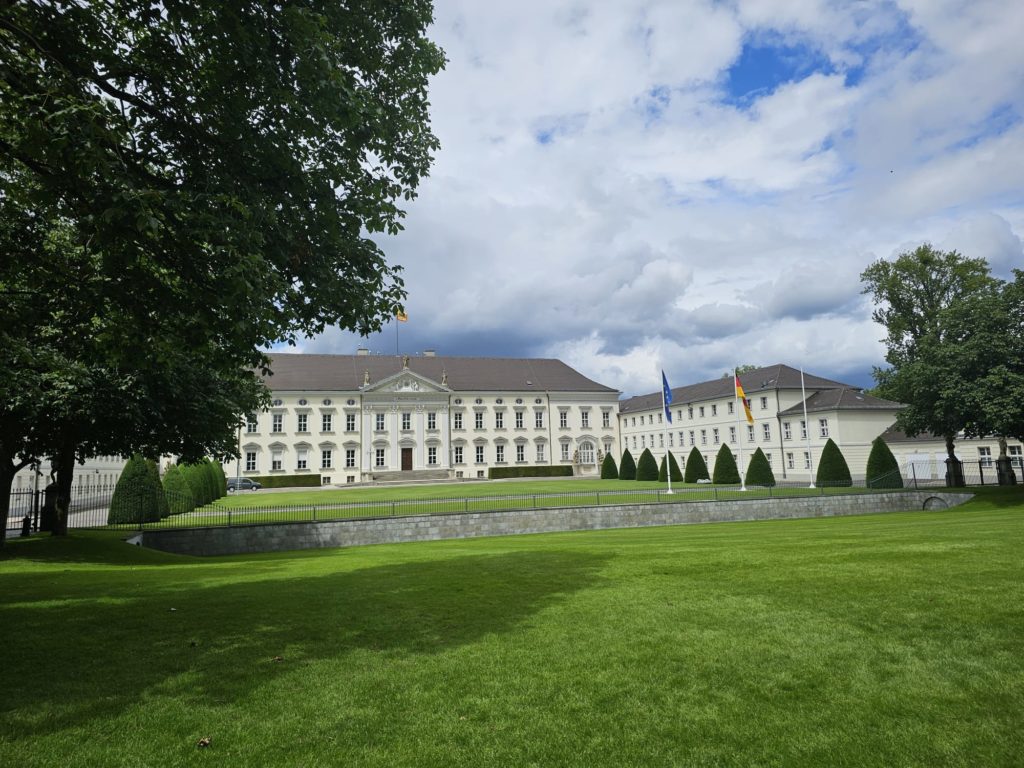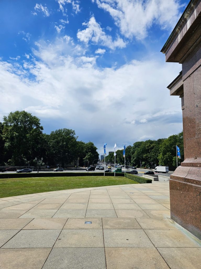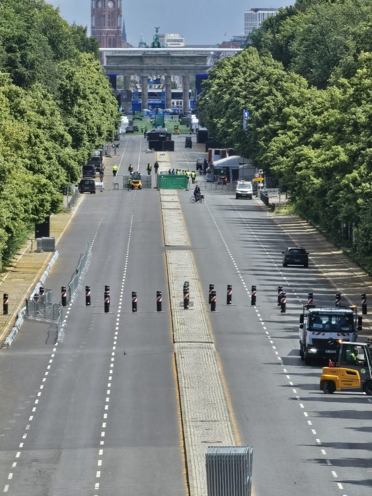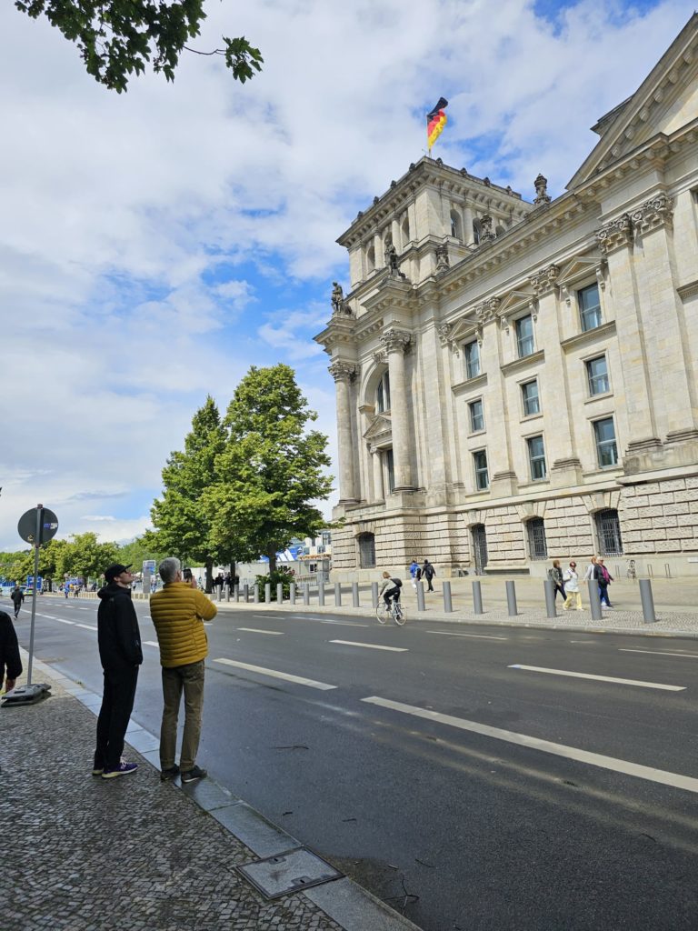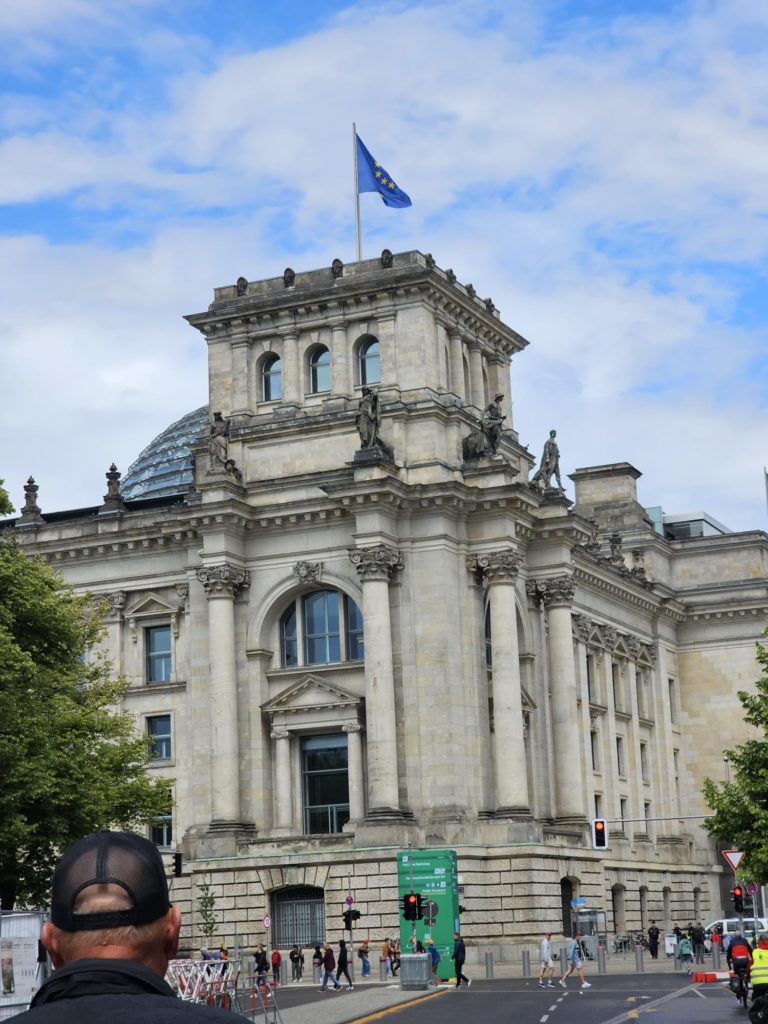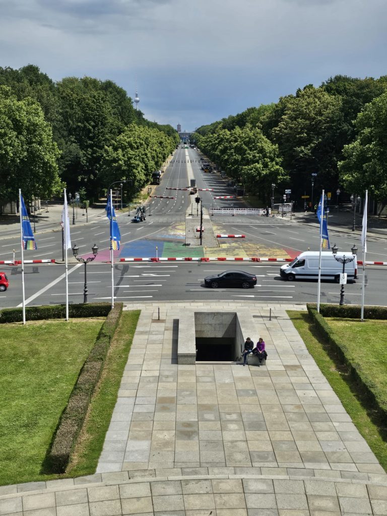 Unfortunately, we didn’t get very close to the Brandenburg Gate, as the largest fan mile in Germany for the European Football (Soccer) Championship was built around the Brandenburg Gate. The European Football Championship 2024 will take place in Germany from June 14, 2024 to July 14. Berlin is one of the main venues. The final will take place in the Berlin Olympic Stadium on July 14, 2024. The Republic Square (Platz der Republik) in front of the Reichstag was also largely cordoned off, so we couldn’t take our obligatory tourist photo here either. Bellevue Castle is the first official residence of our Federal President. Some of us still had enough energy to climb the steps to the 50m high viewing platform of the Siegessäule (Victory Column). The Siegessäule on the Großer Stern in the Tiergarten is one of the most important national monuments in Germany and the most important sights in Berlin. Built between 1864 and 1873 to commemorate the Wars of Unification. The crowning Victoria is called “Goldelse” in Berlin vernacular. The Siegessäule stands in the middle of the Großer Stern, which is designed as a six-lane roundabout and can be reached to the west and east via T-shaped pedestrian tunnels below the road. From the viewing platform we were finally able to zoom in on the Brandenburg Gate with our smartphones, so that we were able to take a somewhat acceptable photo of what is perhaps Berlin’s most important landmark. After we had descended the 285 steps to the base of the Victory Column, we agreed that we had done enough physical activity for today. We then went straight to my Berlin cousin’s apartment, where his wife had already prepared coffee and cake for us.
