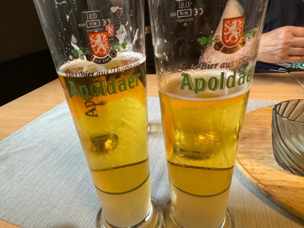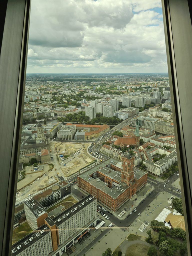 or the next six nights we had booked a nice and large apartment in the eastern part of the city. We were very happy with our choice. We got around Berlin best using public transport, which worked perfectly. Our home route became the M2 tram, which leads from our apartment directly to Alexanderplatz. We spent our first afternoon and evening in Berlin around Alexanderplatz. Here we were able to get a first impression of the unmissable television tower, the red town hall, the Berlin Cathedral, the Neptune Fountain, the new Humboldt Forum in the newly built Berlin Palace and the Lustgarten opposite. We had dinner at Mio Berlin under the television tower. It is a good Italian restaurant with a large selection of dishes, an international audience and good service. What impressed us most were the huge two liter and one liter Warsteiner beer glasses.