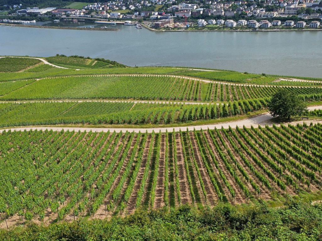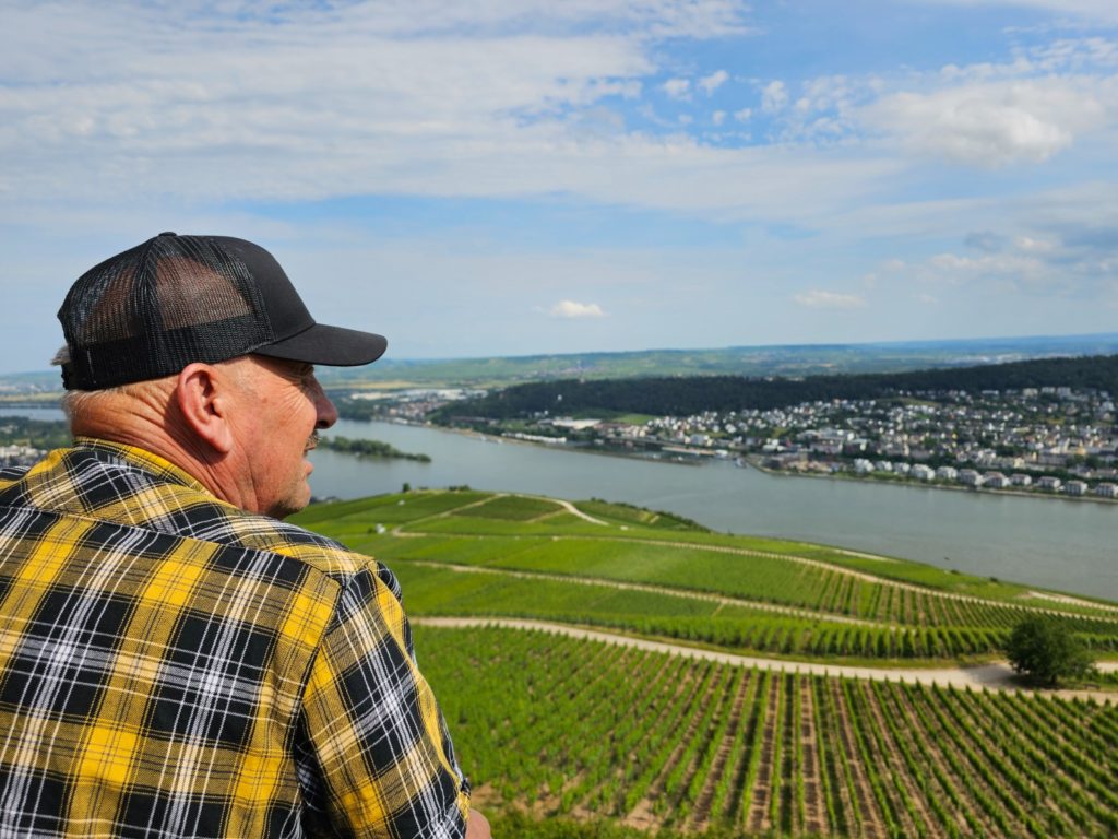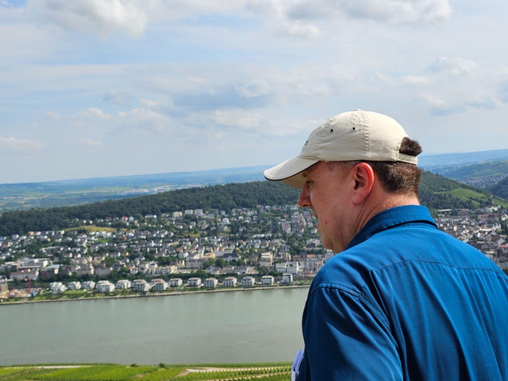 In 1953, Federal President Theodor Heuss declared the area around the Deutsches Eck a monument to German reunification. The new German flag was hoisted in place of the statue of Kaiser Wilhelm I, which was destroyed by artillery fire in 1945. In 1993, after controversial discussions, a replica of the original sculpture group was placed back on the base. After we walked from our parking lot on the Moselle around the Deutsches Eck to the Rhine, we reached our paddle wheel steamer MS Goethe, with which we traveled from Koblenz up the Middle Rhine Valley to Rüdesheim. In 2002, the Middle Rhine Valley was declared a World Heritage Site by UNESCO. This part of the Rhine stretches over a distance of 65 km along the banks of the Rhine between Bingen, Rüdesheim and the historic center of Koblenz.