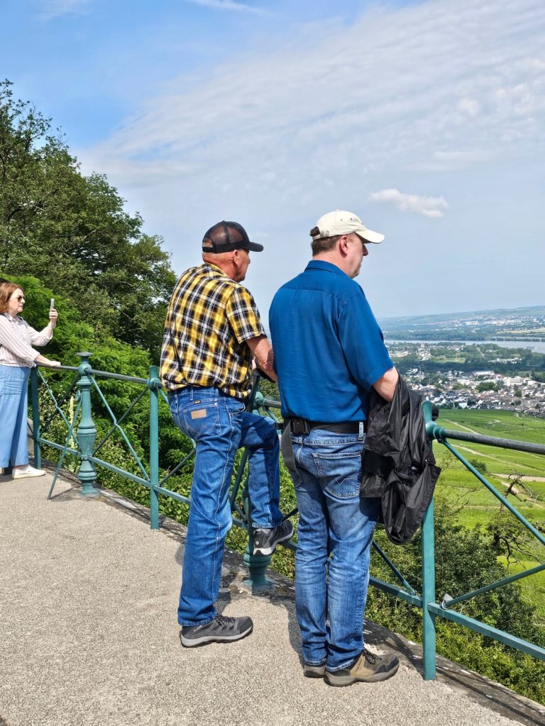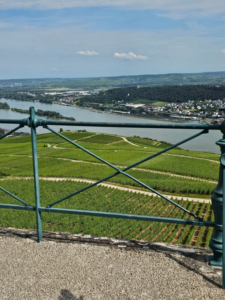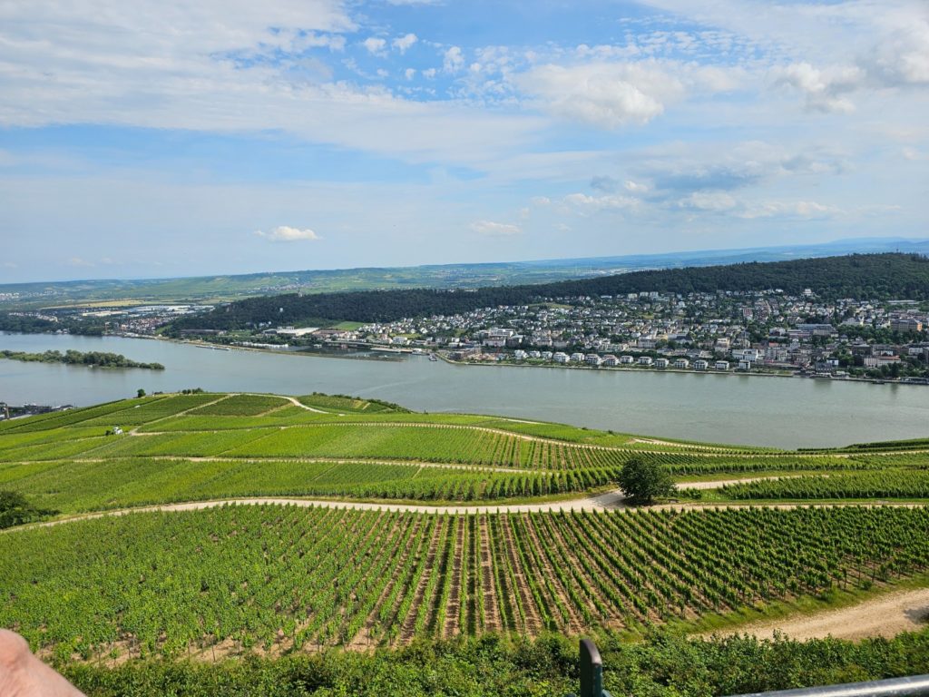 The Middle Rhine Valley lies in Rhineland-Palatinate, on the southern eastern bank also in Hesse, and separates the Taunus in the east from the Hunsrück in the west. The uniqueness of this cultural landscape is the extraordinary wealth of cultural evidence. The Middle Rhine Valley owes its special appearance, on the one hand, to the natural formation of the river landscape and, on the other hand, to human design. For two millennia it has been one of the most important transport routes for cultural exchange between the Mediterranean region and northern Europe. Located in the heart of Europe, sometimes a border, sometimes a bridge of cultures, the valley exemplifies the history of the West. With its high-ranking architectural monuments, its vine-covered slopes, its settlements clustered together on narrow ledges and its hilltop castles lined up on rocky outcrops, it is considered the epitome of Rhine romanticism. Last but not least, it inspired Heinrich Heine to write his Lorelei song. The Loreley is a 132 meter high slate rock face near Sankt Goarshausen, located at the deepest and narrowest point in the Middle Rhine. It rises steeply on the right bank of the Rhine and offers a wide view of the river bend near Sankt Goarshausen and Katz Castle. The Loreley Passage used to be one of the most dangerous sections of the Rhine for shipping. The river bed, which is still 300 meters wide above the Kammereck, is narrowed to 145 meters by the rock barriers just before the Loreley, at the Betteck. At the Loreley itself, the Rhine was 160 meters wide and up to 25 meters deep. This is the narrowest and deepest part of the Rhine. We reached Rüdesheim around 3:00 p.m. and disembarked. Our trip on the MS Goethe on the Rhine was wonderful.