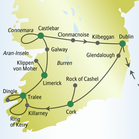 Nachdem ich letztes Jahr meiner kanadischen Cousine einen ersten Eindruck von Europa vermittelte, fiel mir auf, dass ich trotz all meinen vielen Reisen noch nie auf Irland gelandet war. Dabei hatte ich schon sehr viel Positives über die grüne Insel mit seinen schroffen Küsten, Guinness, Pubs, lebenslustigen Menschen mit ihrer allgegenwertigen Musik, der fantastischen irischen Literatur und seiner keltische Vergangenheit gehört. Ich entschloss mich für die zwölftägige Studiosus „Me & More“ Irlandrundreise durch den südlichen Teil der Insel.
