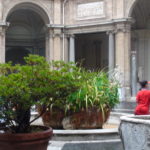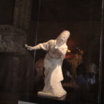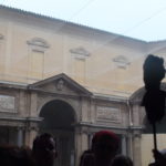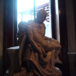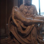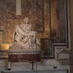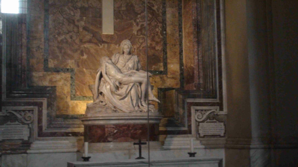 Michelangelo meisselt in den Jahren 1497-1500 (als 23jähriger) die Skulpturengruppe der Pietà, die heute in der ersten rechten Seitenkapelle im Petersdom in Rom zu sehen ist. Der junge Bildhauer aus Florenz wird schlagartig berühmt – die Peterskirche war damals die meistbesuchte Stätte der Christenheit, Ziel für Pilger und Machtträgern aus aller Welt. Es ist das einzige Werk, das er je signierte.