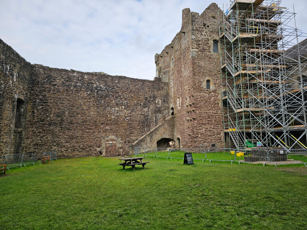Die unvollendet gebliebene Burg ist auf drei Seiten von steil abfallenden Hängen geschützt. Der Zugang von Norden ist durch Erdwälle befestigt. Um einen geräumigen, von hohen Mauern umgebenen Innenhof gruppieren sich die Wohn- und Repräsentationsbauten, darunter als dominierendes Bauwerk der 30 Meter hohe, vierstöckige Wohnturm Lords Hall, durch dessen Erdgeschoss der 14 Meter lange gewölbte Torweg führt, sowie die Great Hall mit Küche.